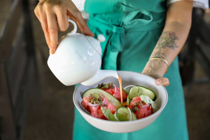 Además del Gazpacho de tomate rosado ($ 13.000), con alcaparra frita, sandía, pepino y albahaca.