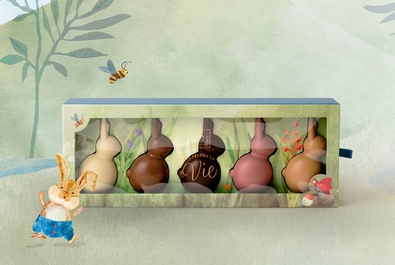 Además de la caja de conejos surtidos ($ 17.900), con cinco conejos en distintas variedades y colores, como Ruby, uno rosado de 34% cacao.
