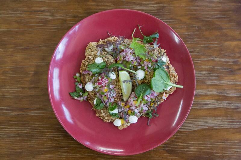 También podrás degustar la "mila de berenjena". Se trata de tres sabrosas láminas de esta verdura apanada en avena y cubiertas de un ceviche de pimentones verdes y amarillos, rabanitos, cebolla morada y cremoso de zanahoria naranja ($ 4.000).