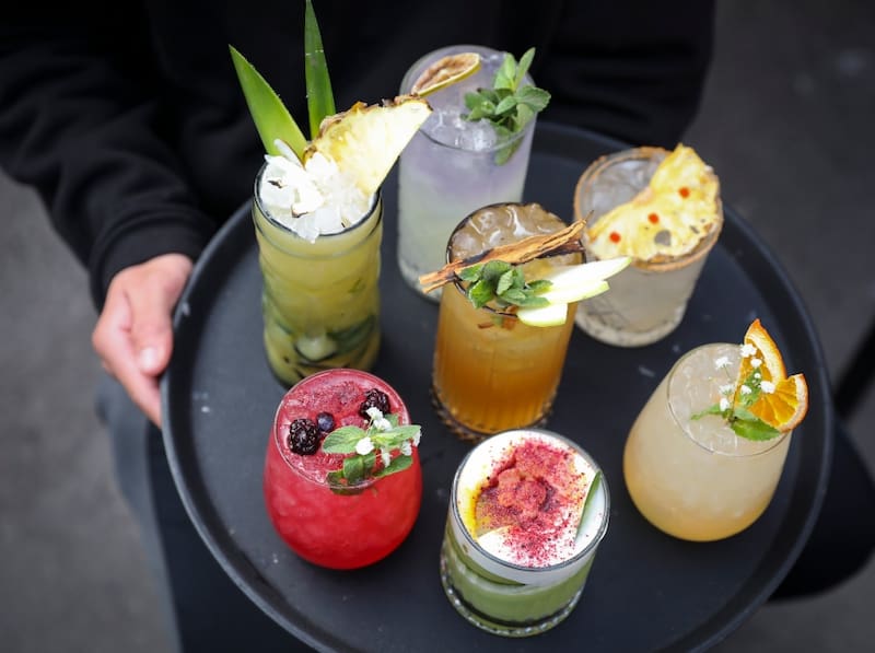 Acá no podían faltar las jarras, vitales si la idea es ir en grupo para probar más y compartir. Como la de clérico del Egeo ($21.500) de Sauvignon Blanc, pisco, vermut blanco, tomillo, orégano, agua con gas; o la de tinto ibérico ($21.500) de Cabernet Sauvignon, gin, frutilla, tomillo, naranja y limón.