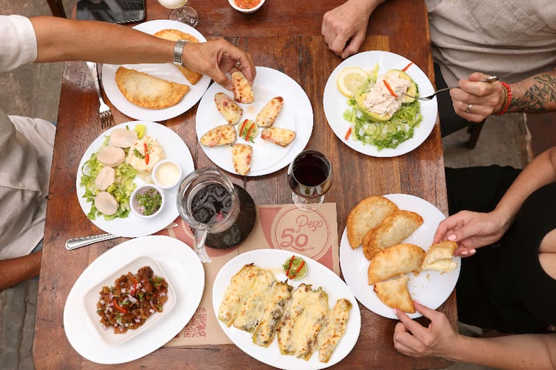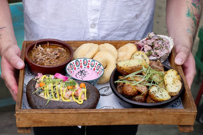 Lase puedes pedir con alguna de las tablas, como la Changa ($20.000), con calugas de pescado frito, calamar al olivo, sopaipillas, ceviche, papas y distintos tipos de salsa como el alioli.