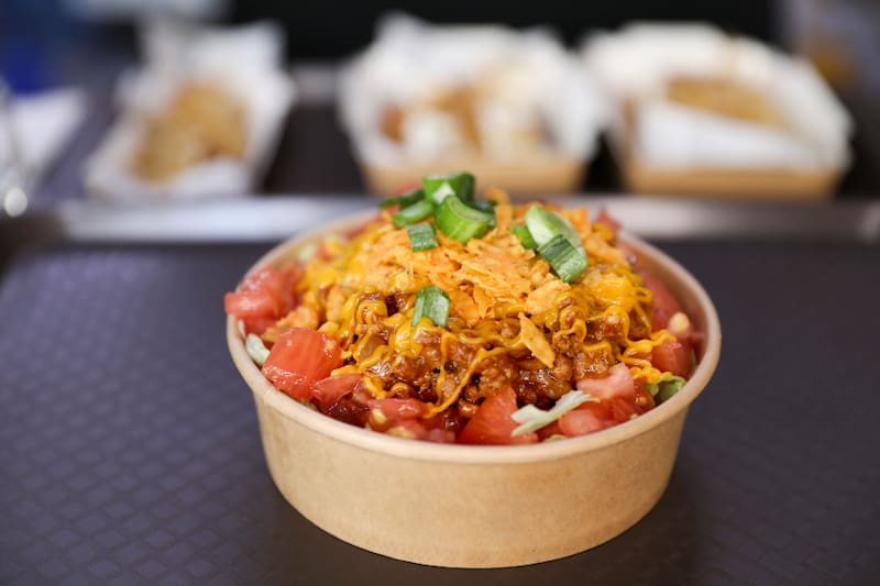 Se trata de carne molida al estilo taco, hecha con los secreto de Santako, que viene sobre arroz y una cubierta de lechuga y queso.