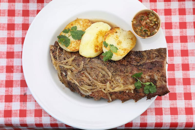 Y que puedes acompañar de platos como el Lomo liso ($ 16.500), con agregados como la ensalada chilena; papas fritas o mix verde. También Costillar de cerdo ($ 14.500); o Arrollado Huaso.