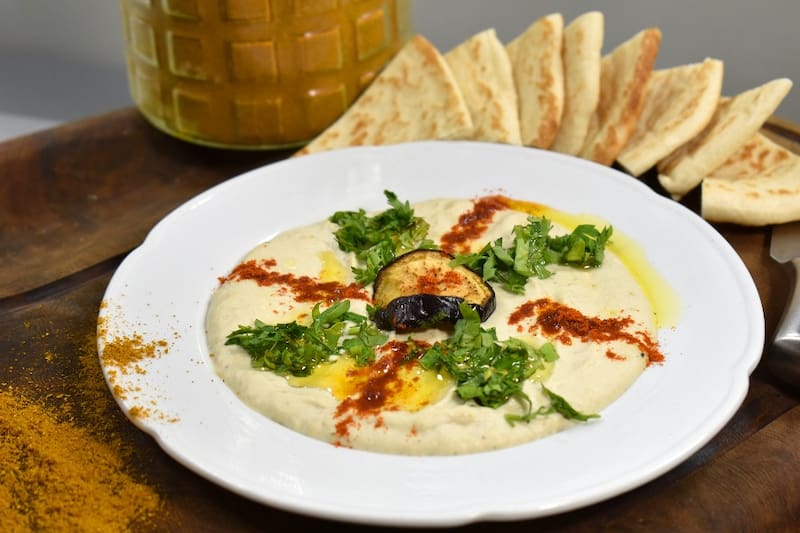 Ojo, que hay babaganoush ($ 4.490), un dip de berenjenas asadas con salsa de sésamo y limón, que se sirve con aceite de oliva, ají de color, perejil y mini pan pita para picotear.