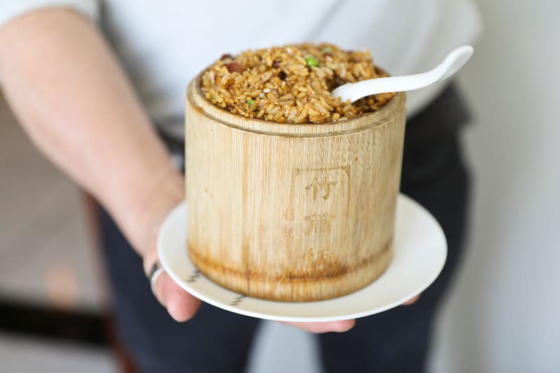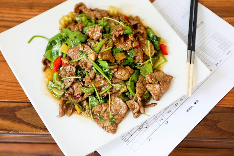También la carne mongoliana, con cebollín y aceite de soya que puedes pedir con arroz ($ 3.000), que llega en una vaporera de bambú.