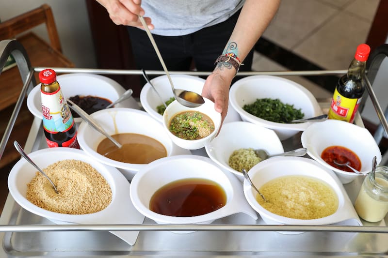 Además, te traerán un carritopara que hagas tu salsa, con ingredientes como soya, salsa de ostras, aceite de sésamo, mirin -que es una salsa agridulce-, semillas de sésamo, pasta de ajo o cebolla crujiente, por ejemplo.