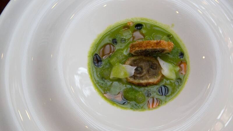 Luego "crocante chunchul", que es parte del intestino grueso, y que aquí es un bocado elegante, sabrosísimo y viene acompañado con una sopa fresca, con pepino, jibia y limón.