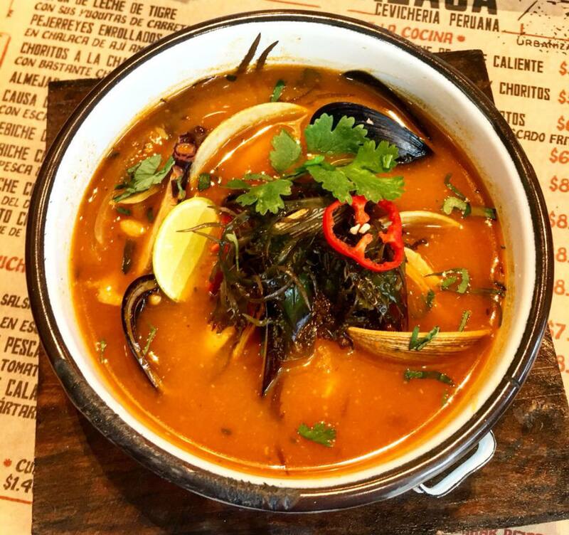 Aquí el concepto es el mismo, un caldo sabrosísimo, hecho con un fondo de jaiba, cebolla, ajo y ají amarillo, al que se suman mariscos como choritos y almejas, más camarón, pulpo y el pescado del día que puede ser róbalo o reineta. Riquísima.