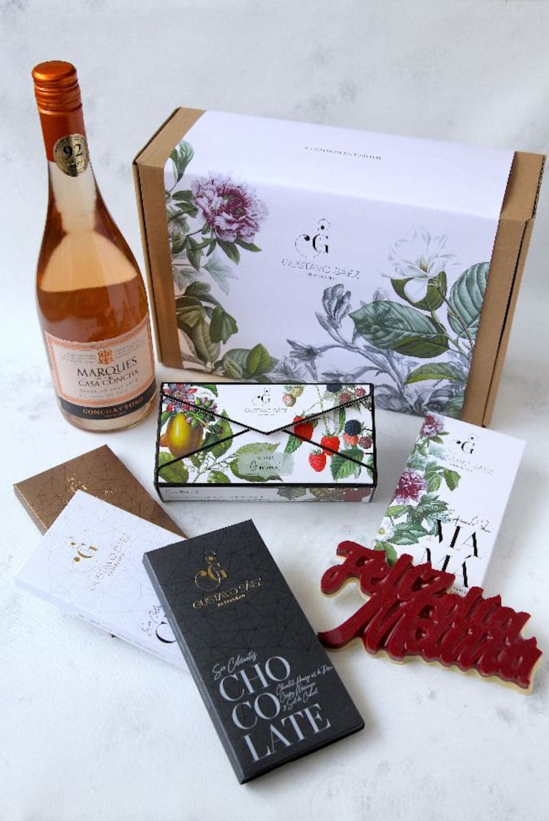 De hecho, ahí tiene un kit especial Día de la Mamá ($ 49.990, en la foto), que incluye un vino Marqués de Casa Concha Rosé, más una tableta especial de Felíz día mamá y un pack de tres tabletas de chocolate a elección.
