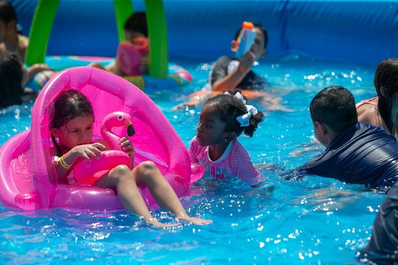 La Mansión Embrujada, La Ola Gigante, el Taca Taca Humano, el Túnel Acuático y el Camaleón son algunos de los juegos en los que niñas y niños saltan, se divierten y refrescan.