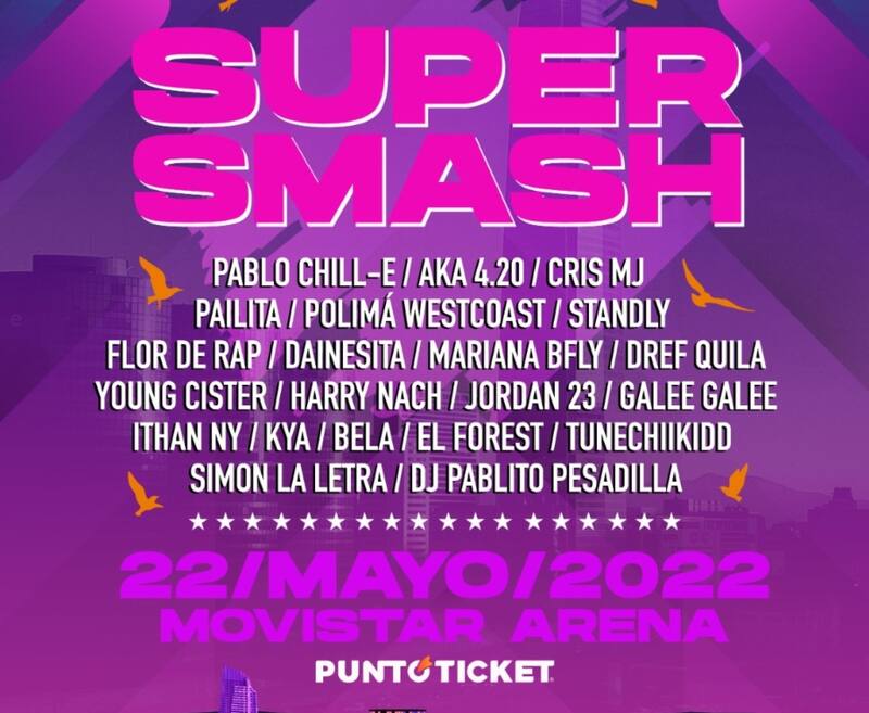 Nombres como los de Pablo Chill-E, AKA 4.20, Chris MJ, Pailita y Polimá Westcoast, entre muchos otros serán los que tocarán en Super Smash, que se realizará el domingo 22 de mayo, a la 1.30 PM, en Movistar Arena.