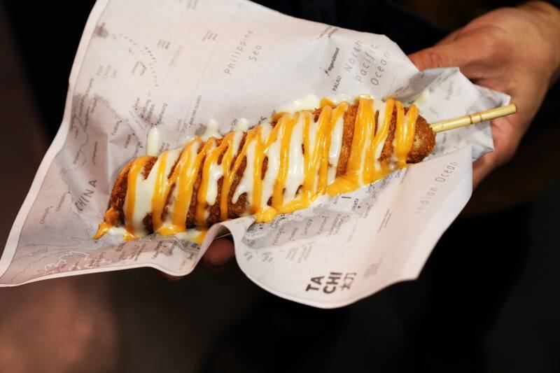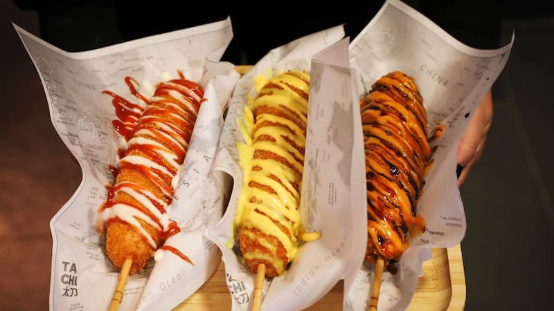 Son diferentes a los tradicionales, porque consiste en una masa rellena con una salchicha, cubierta de panko, que se fríe y se sirve con un palito, al estilo de una helado.