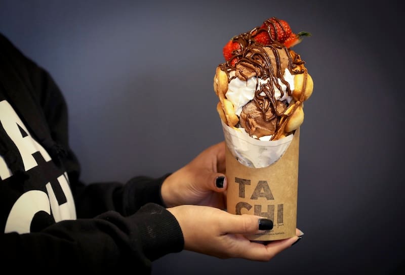 Al igual que uno de los hits de Tachi y de los más pedidos, los bubble waffle ($ 5.990), los mismos que son furor en puestos callejeros de Hong Kong y cuya característica es su masa con burbujas.