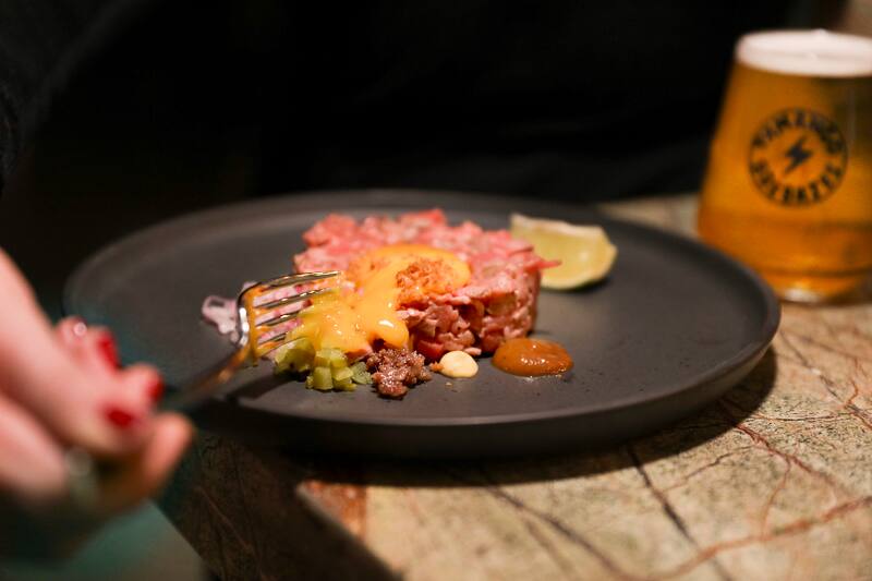 También el tartare ($ 10.900), que es un tártaro de filete con pepinillos, chalotas, anchoas, rabanitos y perejil, que tiene encima una yema de huevo líquida y frita, lista para que la pinches.