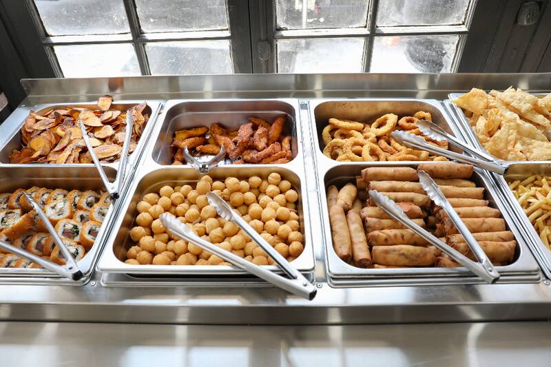 También cuenta con un amplio buffet, donde puedes encontrar una variedad de ensaladas, sushi, ceviche, papas duquesa, papas fritas, lasaña, pastel de choclo, e incluso platos de cocina china, como wantán o arrollados primavera.