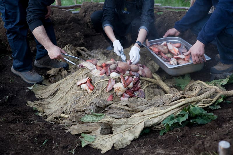 Se trata de una experiencia que se ofrece los findes de semana y se hace según la tradición, en un hoyo en la tierra, con piedras calientes, todo tapado con hojas de pangue y tape.