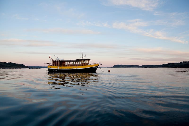 A bordo de la Williche disfrutarás de un coctel mientras miras pueblos, colinas y, si tienes suerte, toninas, como se le dice en Chiloé al delfín chileno.