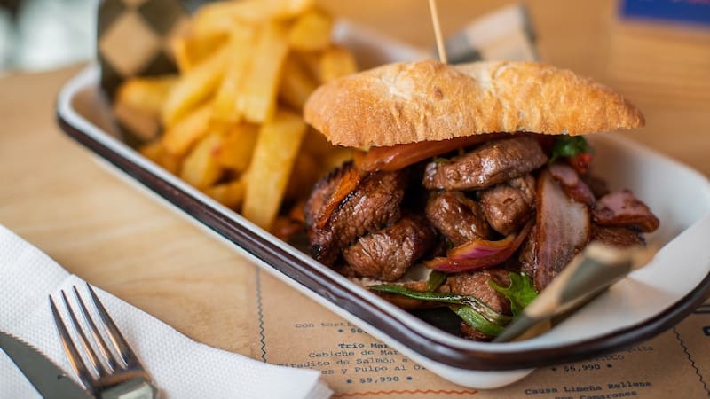 Prueba el sándwich de "Lomo saltado" ($ 8.990), que aquí se hace con filete, blando y jugoso, acompañado de una buena porción de papas fritas.