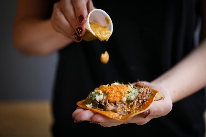 Se trata de tacos que vienen con cebollín, cilantro, frijol y salsas, como el de birria ($ 2.000), la mezcla de carne de vacuno y chancho, hechos con una salsa de tres tipos de ajíes, como el guajillo y cacho de cabra.