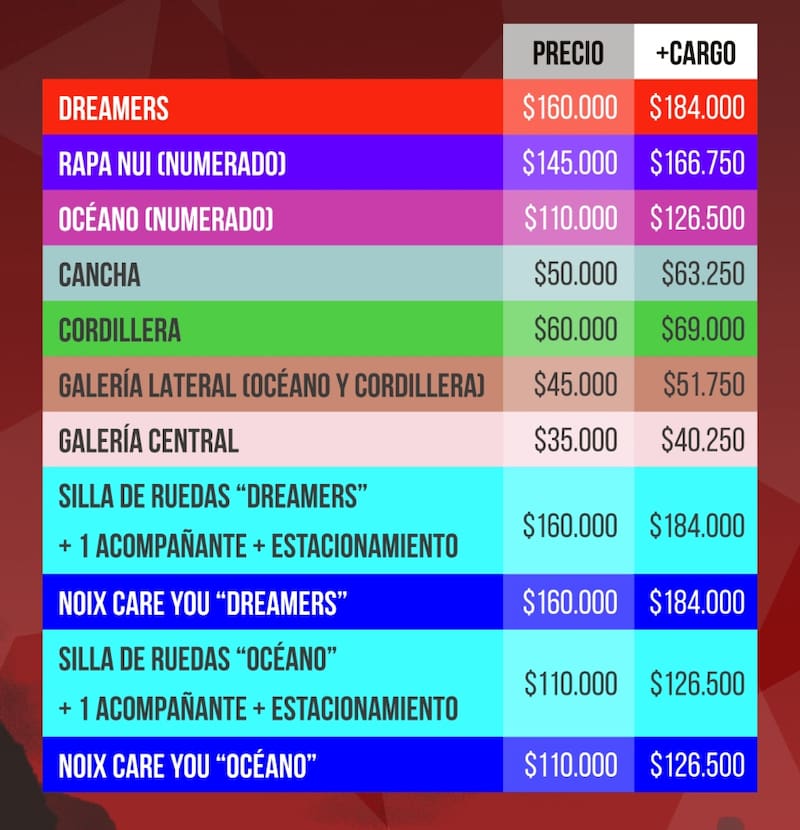 En tanto, el valor más caro es de $ 184.000, que corresponde a Dreamers, la ubicación VIP justo frente al escenario y que también incluye varios beneficios, como acceso desde la mañana, zonas de relajación, fansclub y k-beauty, entre otras.