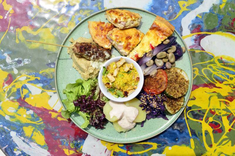 Se trata de un colorido plato con distintas preparaciones: un cuscús con verduras salteadas y curry; unos buñuelos de masa delgada rellenos con salmón, y una “caponata”, un guiso italiano de tomates y berenjena que se come con pan focaccia hecho en el lugar.