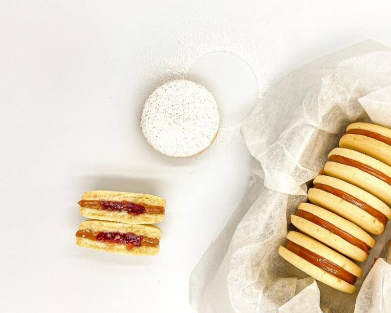 - Manguear un anillo de manjar por el contorno de cada galleta, rellenar el centro con la mermelada de frambuesa Cerrar cada alfajor con las galletas restantes.