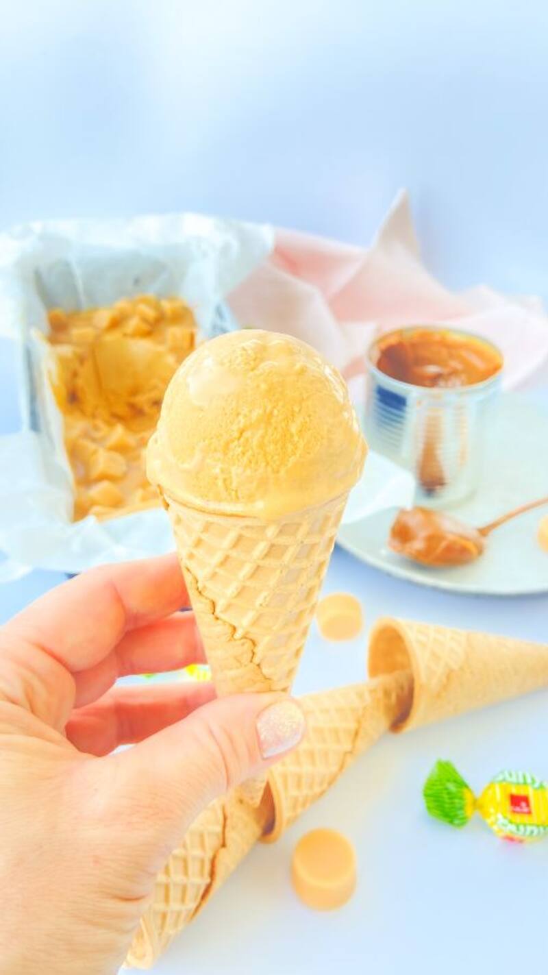 - Verter la mezcla del helado en la fuente. Dejar congelar por 1 hora para que tome un poco de consistencia y agregar las calugas cortadas en trozos pequeños (si las agregan de inmediato se caerán al fondo).