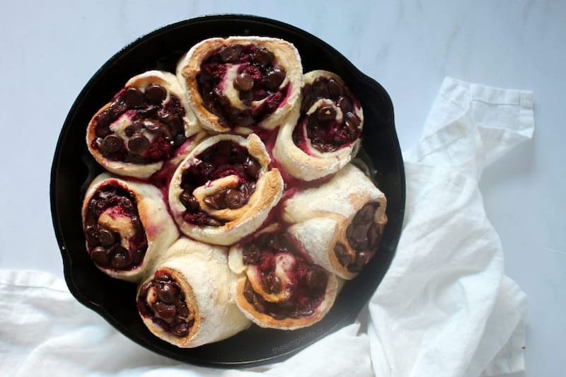 - Esparcir las frambuesas, chocolate y ralladura de naranja sobre la masa. Enrollar firmemente y cortar en 8 trozos con hilo dental.