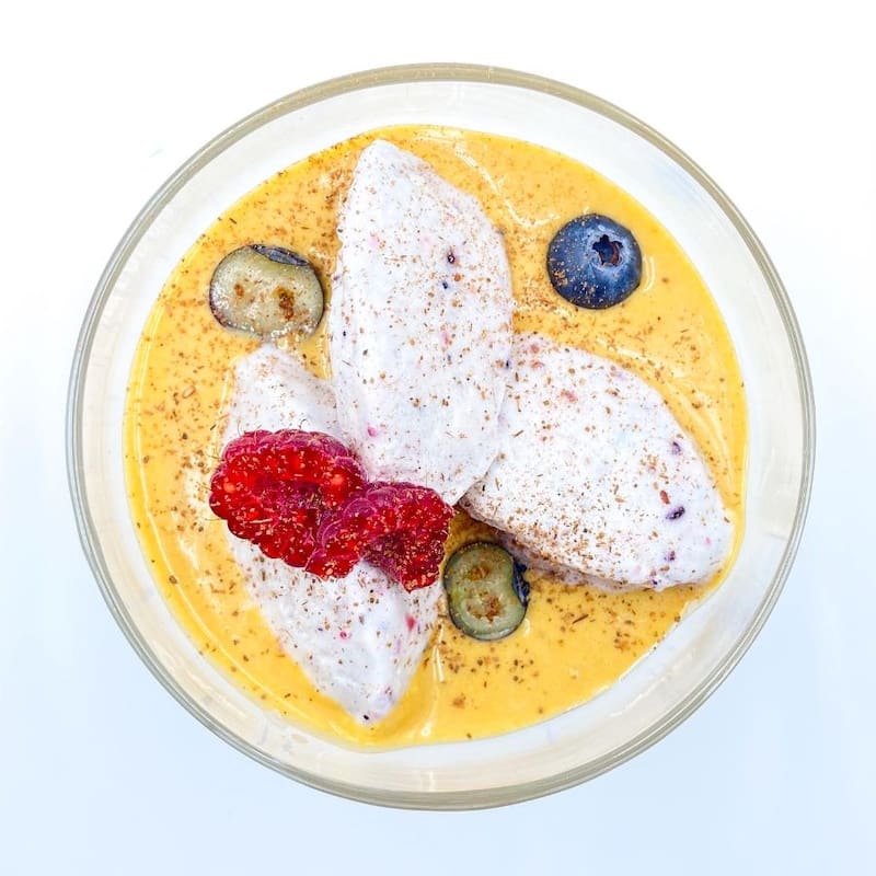 - Decorar con los trozos de mango macerados y con el mango deshidratado.
