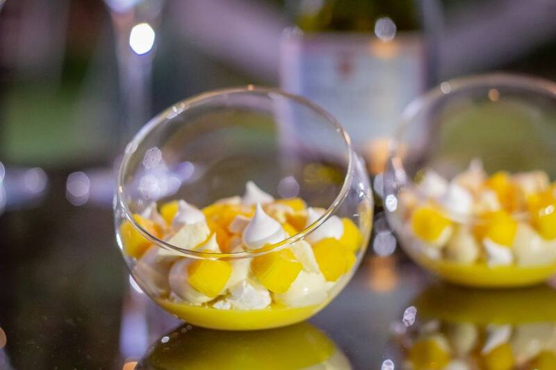 - Quebrar trozos irregulares del disco de merengue seco y distribuir dentro de los vasitos con la ganache de mango.