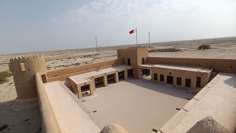 Al terminar el recorrido por las ruinas, el camino nos lleva de vuelta al fuerte que domina el paisaje. Es fácil confundirse y pensar que es parte de la ciudad original, pero este edificio fue construido mucho después, en 1938, bajo las órdenes del Sheikh Abdullah bin Jassim Al Thani.