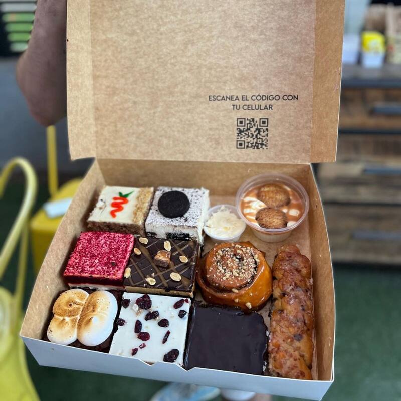 O la Box Deluxe ($ 29.850), que son cuatro trozos de torta a elección, tres brownies, un postre cup y dos stickys o twist.