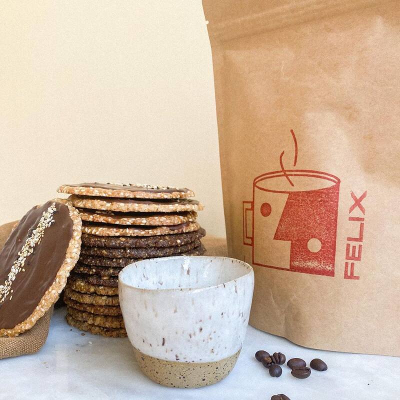 Cuesta $ 26.000 r incluye 250 gramos de café de especialidad de Felix Café, más un vaso de cerámica gres hecho a mano de @obranormal y un imperdible mix de 15 galletas surtidas, de limón jengibre, cacao naranja y caramelo sésamo de Lemüm