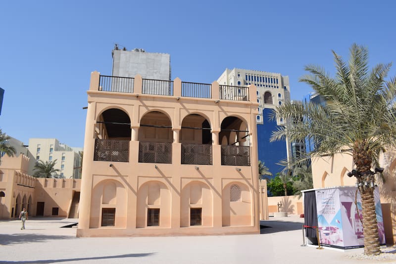 La primera exhibición en el recorrido no es otra que la del propio museo. Para llegar al salón, los visitantes deben cruzar el edificio principal y el patio interior donde se ubica el antiguo palacio del Sheikh Abdullah bin Jassim Al Thani. Ahí, al ingresar, se encontrarán con un gran salón iluminado, cubierto de tela plegada.