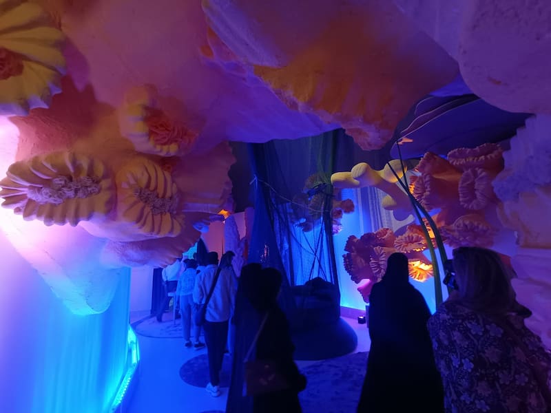 El recorrido sigue al ingresar a una galería azul cubierta de corales y redes suspendidas, donde uno puede recostarse para mirar en el techo el movimiento del agua.