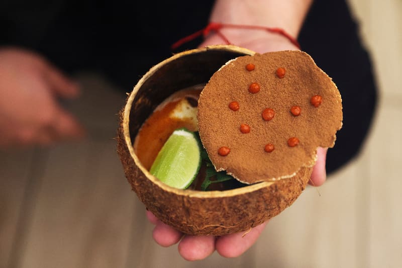 Para no spoilear te contaremos parte de lo que probamos. Partiendo por Trai Khom, un cóctel salino, delicioso, que está inspirado en Vietnam, en base a sake, piña lactofermentada, con syrup de cilantro, naranja y toques de tabasco.
