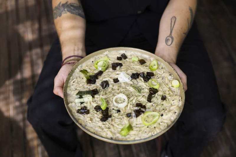 Tiene una textura similar al risotto y lo mezclan con una berenjena cocinada en agave que queda dulcecita y crujiente.