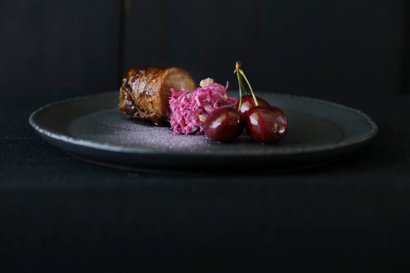 También, solomillo envuelto en tocino, con ensalada de repollo morado y aderezo de labneh con cerezas al sartén, acompañada por el Carmenere Single Vineyard, del Valle de Colchagua.