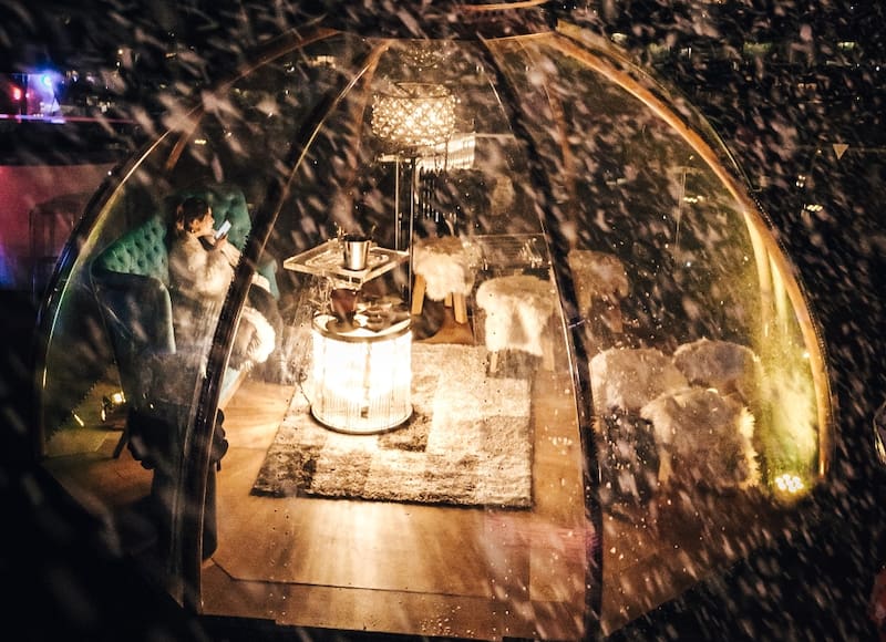 Y es que en la temporada más fría del año se instalan ahí unos domos o iglús, bien calefaccionados, con un mini lounge dentro, y donde puedes tomar un cóctel acompañado de opciones para comer.