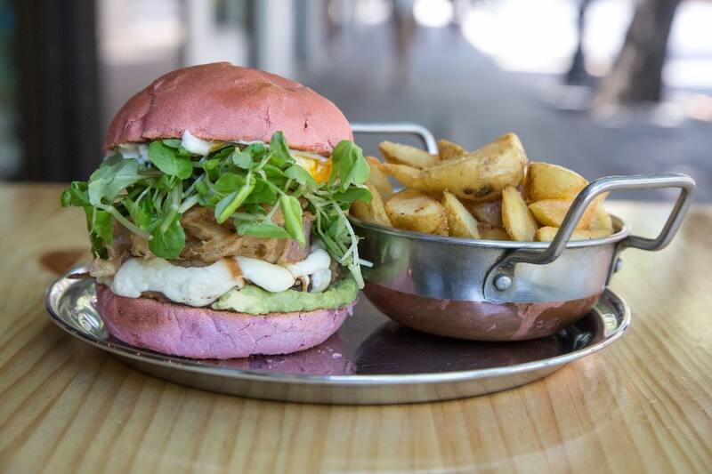 Ahí, puedes probar alguna de las ocho variedades de hamburguesas, como la "pride" que es una de quínoa, porotos negros y champiñones, que viene con queso ahumado -hecho en base a castañas de cajú-, palta, cebolla caramelizada y crispy de berros. Todo en un pan de beterraga vegano que le encargan a Mestiere, la cafetería y panadería de Vitacura.