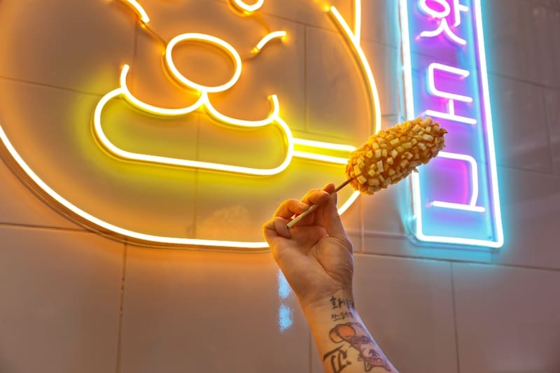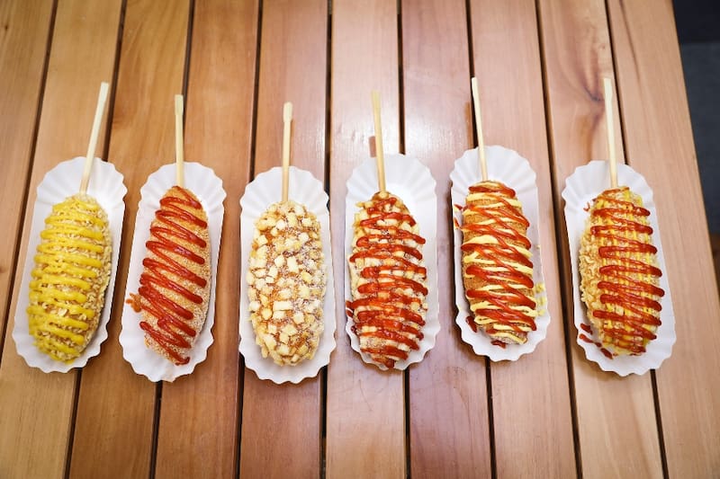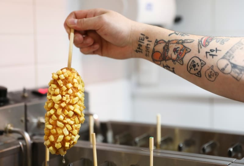 Ahí, uno de los que se suele llenar es este local que se especializa en una preparación infaltable en las calles de Corea, los corn dogs o hot dogs coreanos.