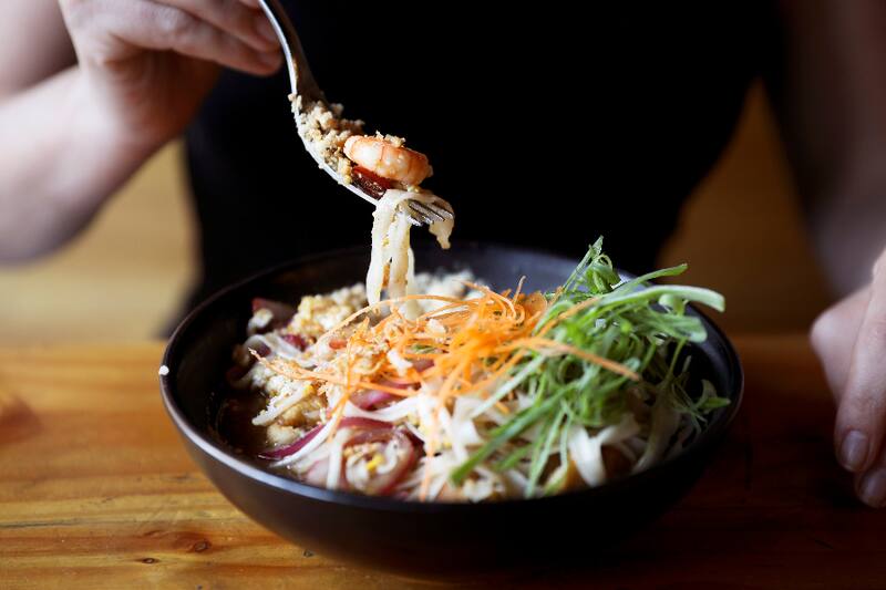 Otra alternativa es que te tientes con el clásico pad thai ($ 8.000), de tallarines salteados con cebollín, zanahoria y dientes de dragón en salsa de tamarindo y maní tostado.