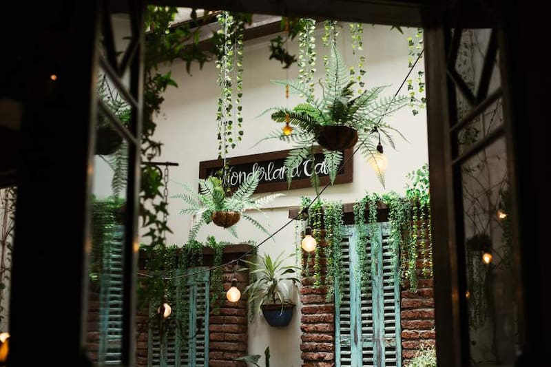 En Wonderland Café hay varios espacios donde te puedes sentar. Tienen una terraza en la calle, una tranquila y hermosa terraza interior y dos pisos con hermosos salones.