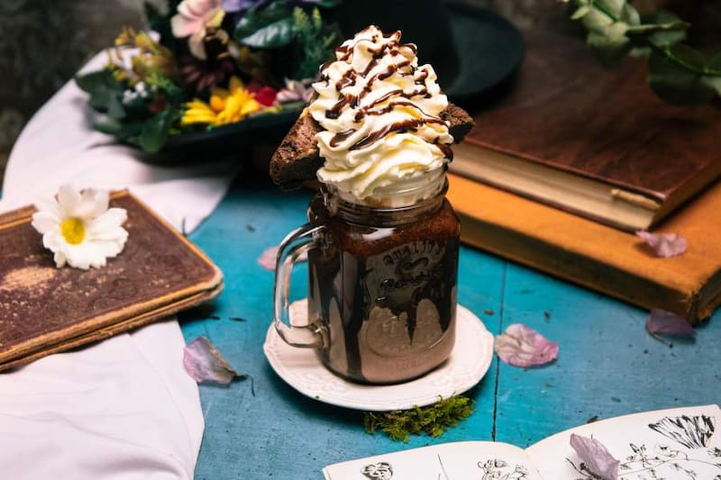 Si buscas algo más goloso, pide un Mad Hatter ($ 7.500), una malteada de chocolate bien dulcecita y contundente, que encima trae un trozo de brownie, coronado con una buena cantidad de crema chantilly.