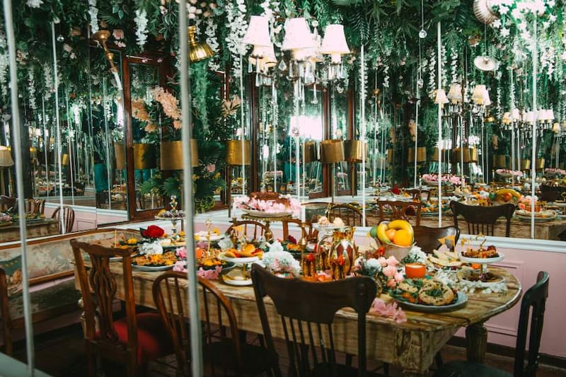 Es un espacio con paredes y techo de espejos, lleno de plantas, enredaderas y luces que le dan un aspecto mágico al lugar.