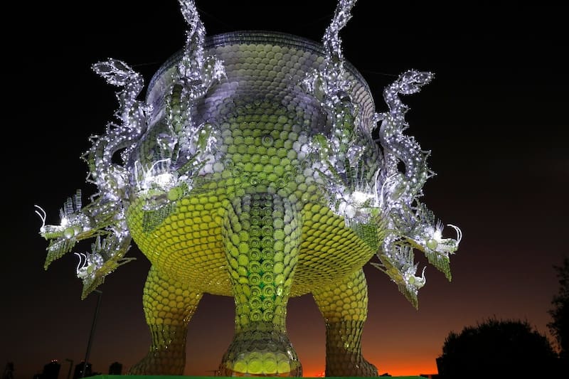 De todas, hay una que merece especial atención: un trípode con cabezas de dragones ubicada al final del recorrido, que se hizo con más de 30.000 platos y tazas chinas y que va cambiando de color. Es realmente asombrosa.