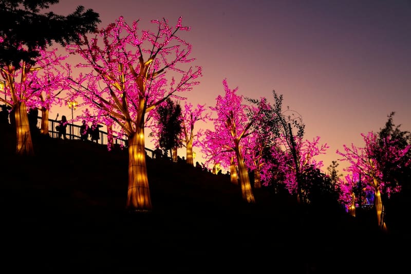 De hecho, son miles de luces las que se aprecian en el parque, ya se dentro de estas estrecturas, o en forma de linternas, de flores como tulipanes o en los árboles simulando preciosos cerezos en flor.
