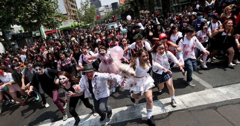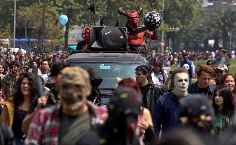El espeluznante desfile que cada año en esta fecha convoca a miles de muertos vivientes que salen de sus tumbas para recorrer las calles de Santiago.