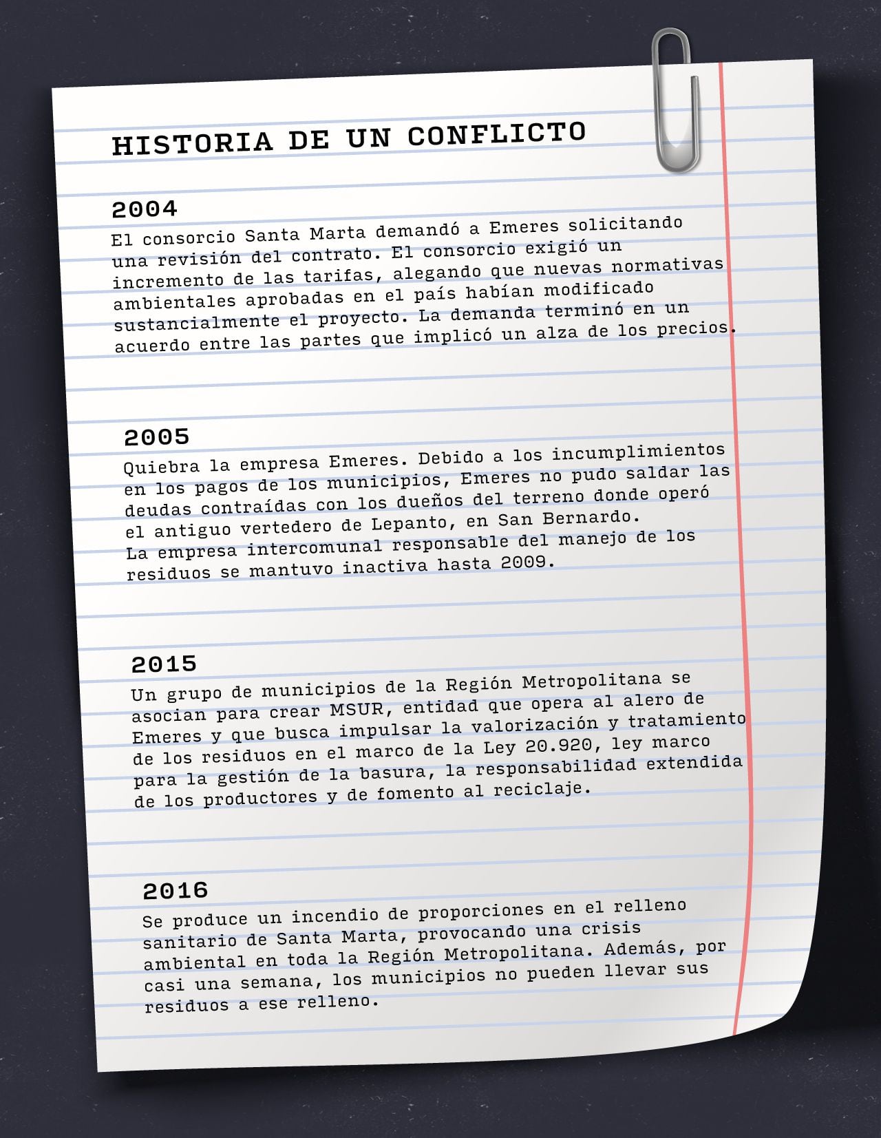 En 2004, primero, y luego en 2019, los dueños del relleno sanitario Santa Marta demandaron a Emeres por un incremento en sus tarifas, alegando que los costos del servicio se habían disparado debido a las obras que han tenido que realizar para cumplir con las nuevas normas ambientales que rigen en Chile y que eran prácticamente inexistentes en el país en 2001, cuando, siguiendo con la lógica privatizadora de esos años, la misma que traspasó al sector privado las empresas sanitarias, esta vez le quitaban a Emeres la gestión de los vertederos para dejar que fueran los privados los que invirtieran en la construcción y gestión de nuevos rellenos sanitarios.
