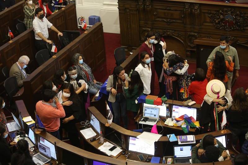 Una vez que el secretario de la Convención, John Smok, dio lectura al resultado de la votación, se desataron abrazos y celebraciones, en especial entre los convencionales indígenas, que ocupaban los escaños frente a la testera del salón principal. Los festejos fueron tales que apenas un par de minutos después, la presidenta de la instancia, María Elisa Quinteros, suspendió el pleno por media hora ante el desorden que había en la sala.
